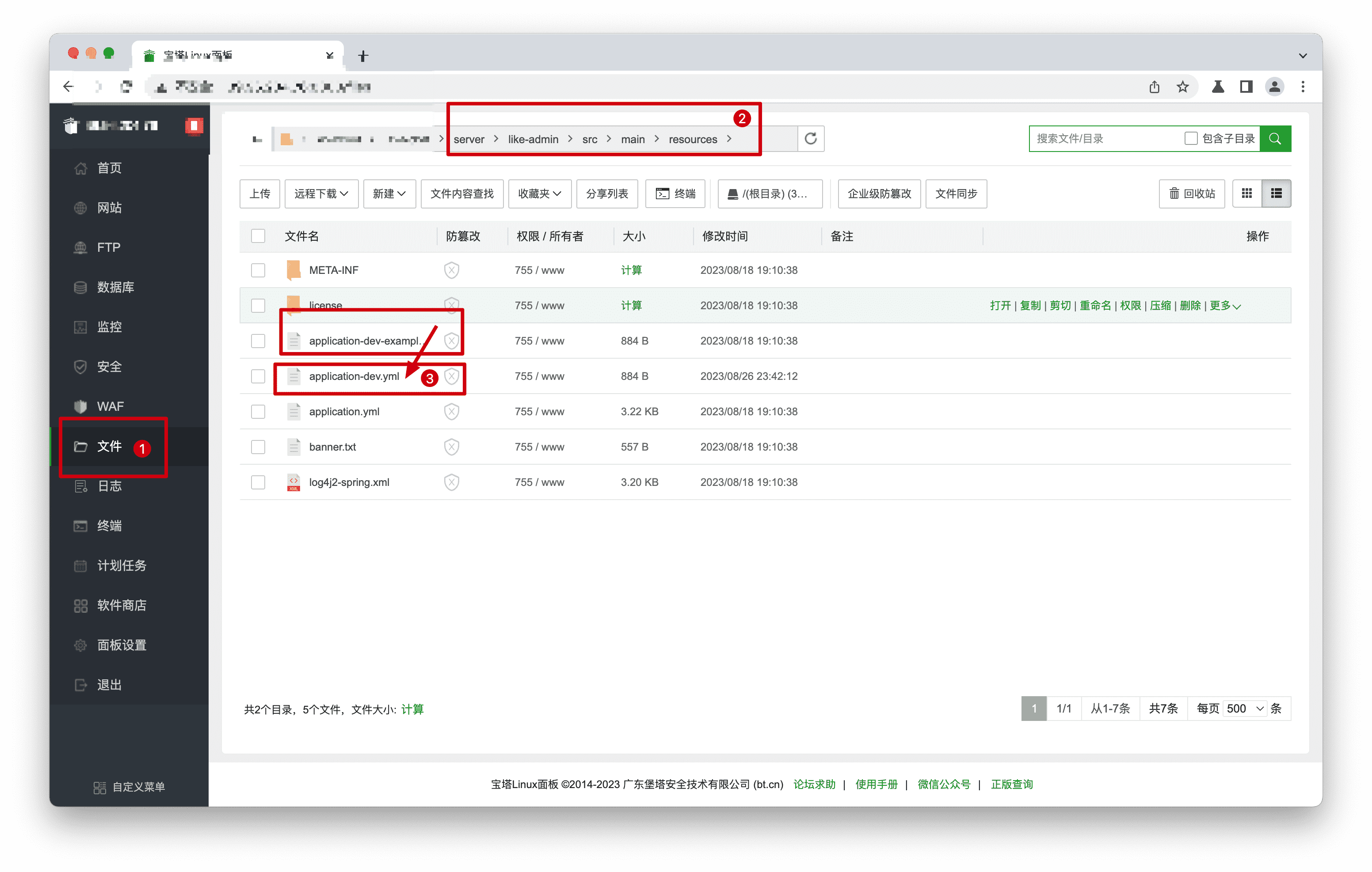 复制server/like-admin/src/main/resources/application-dev-example.yml文件为application-dev.yml文件,打开application-dev.yml文件的内容,上传目录、配置好域名、Mysql、Redis,保存文件。