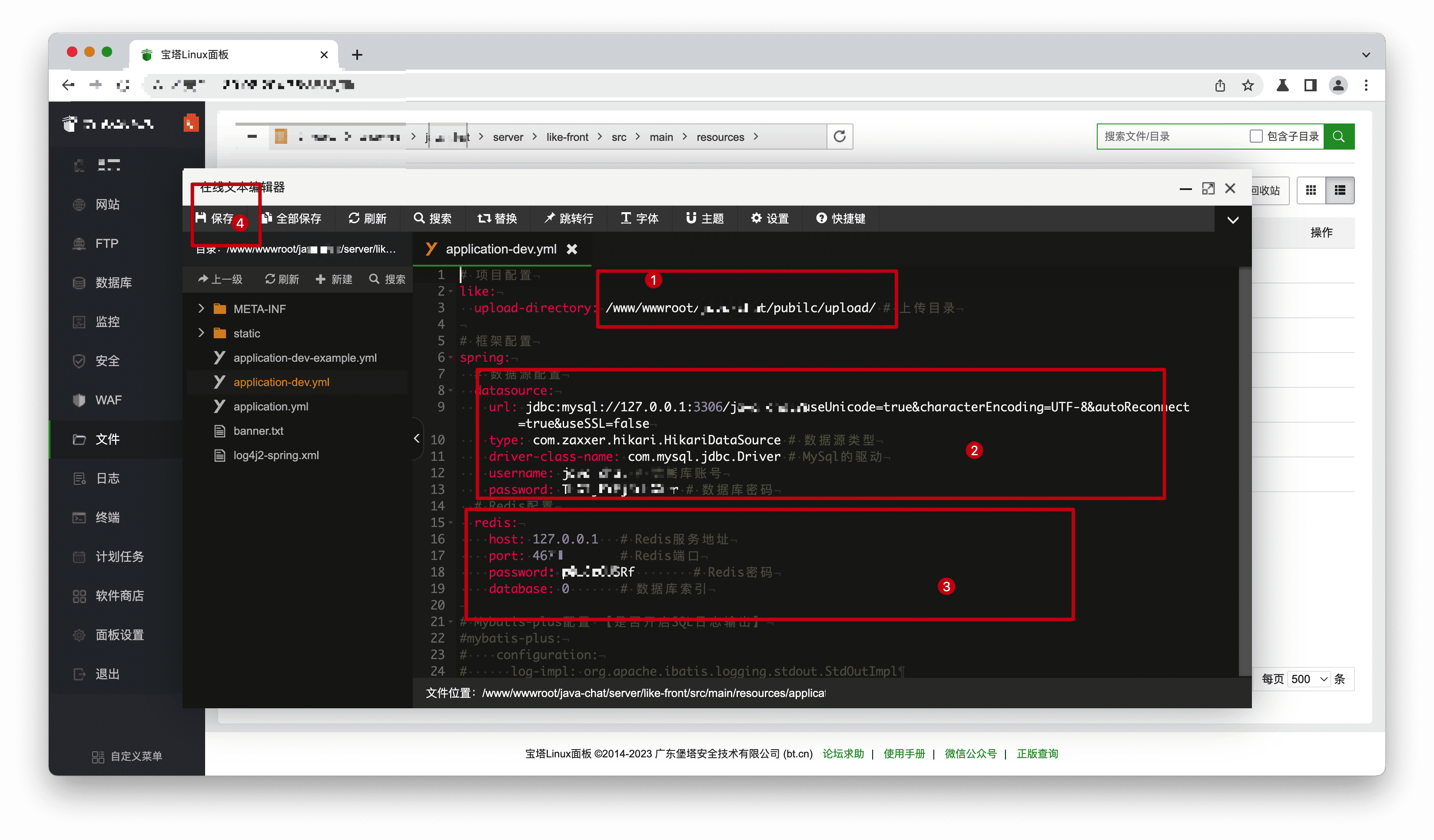 复制server/like-front/src/main/resources/application-dev-example.yml文件为application-dev.yml文件,打开application-dev.yml文件的内容,上传目录、Mysql、Redis,保存文件。
