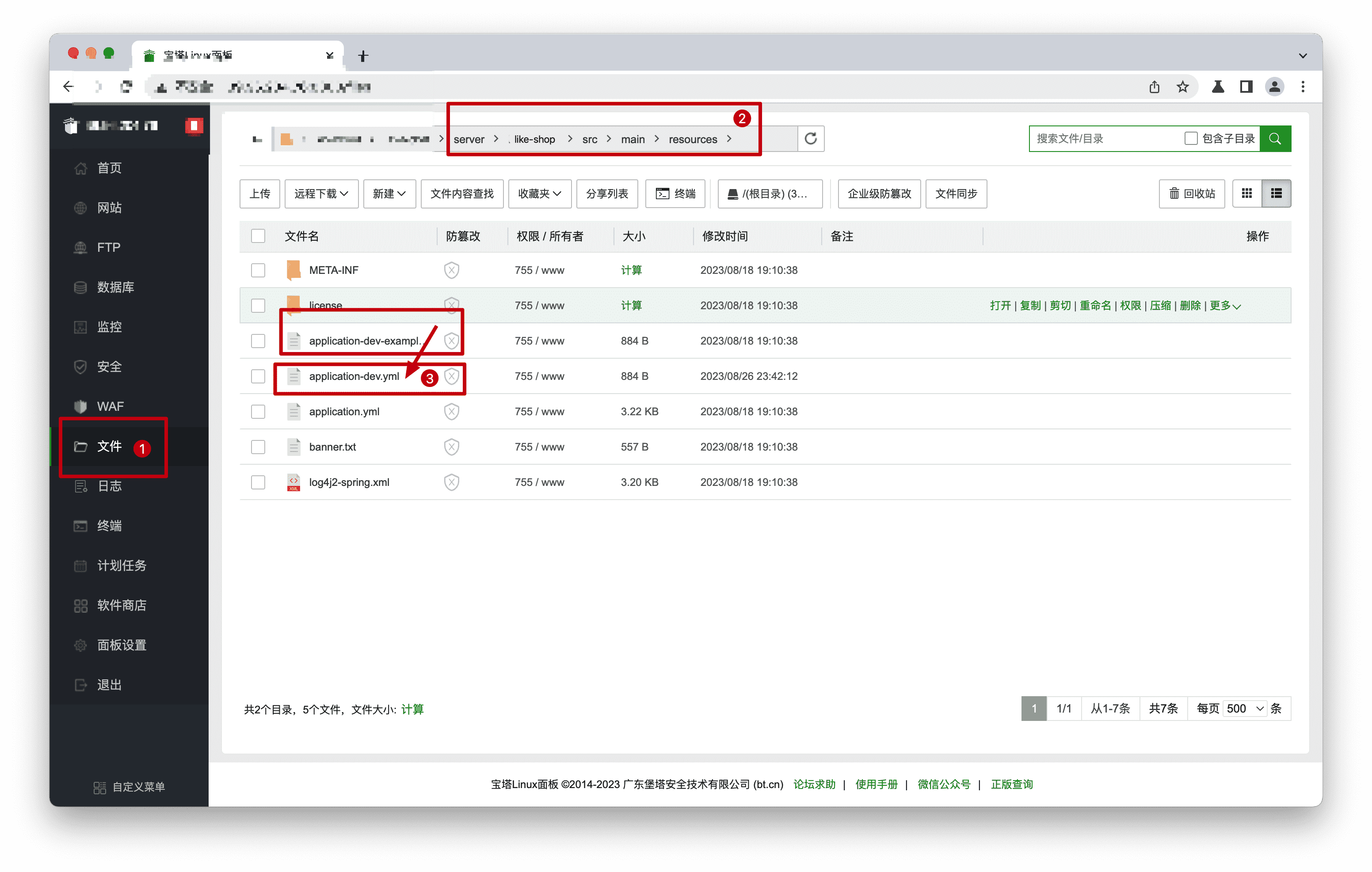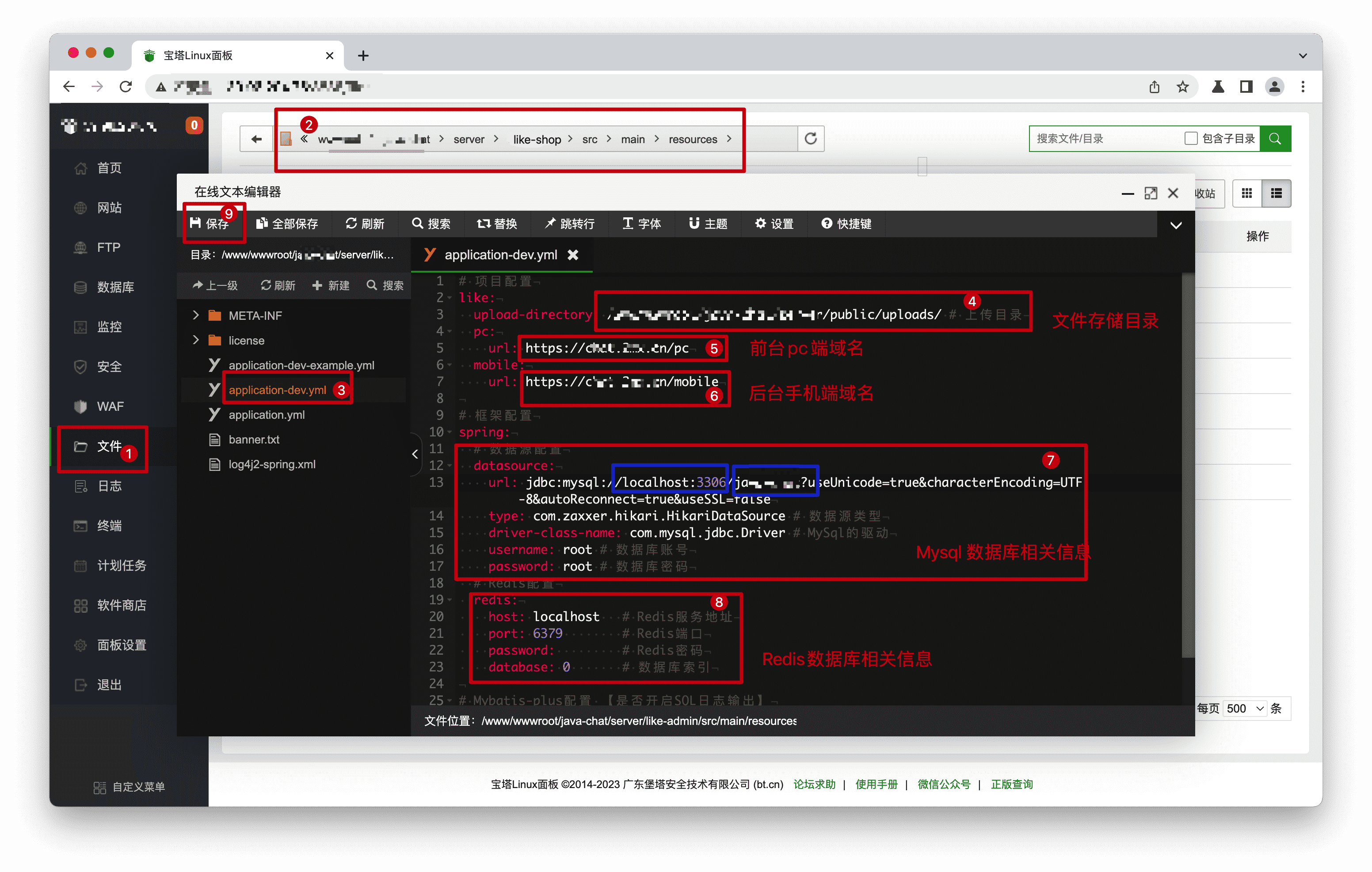 复制server/like-shop/src/main/resources/application-dev-example.yml文件为application-dev.yml文件,打开application-dev.yml文件的内容,上传目录、配置好域名、Mysql、Redis,保存文件。