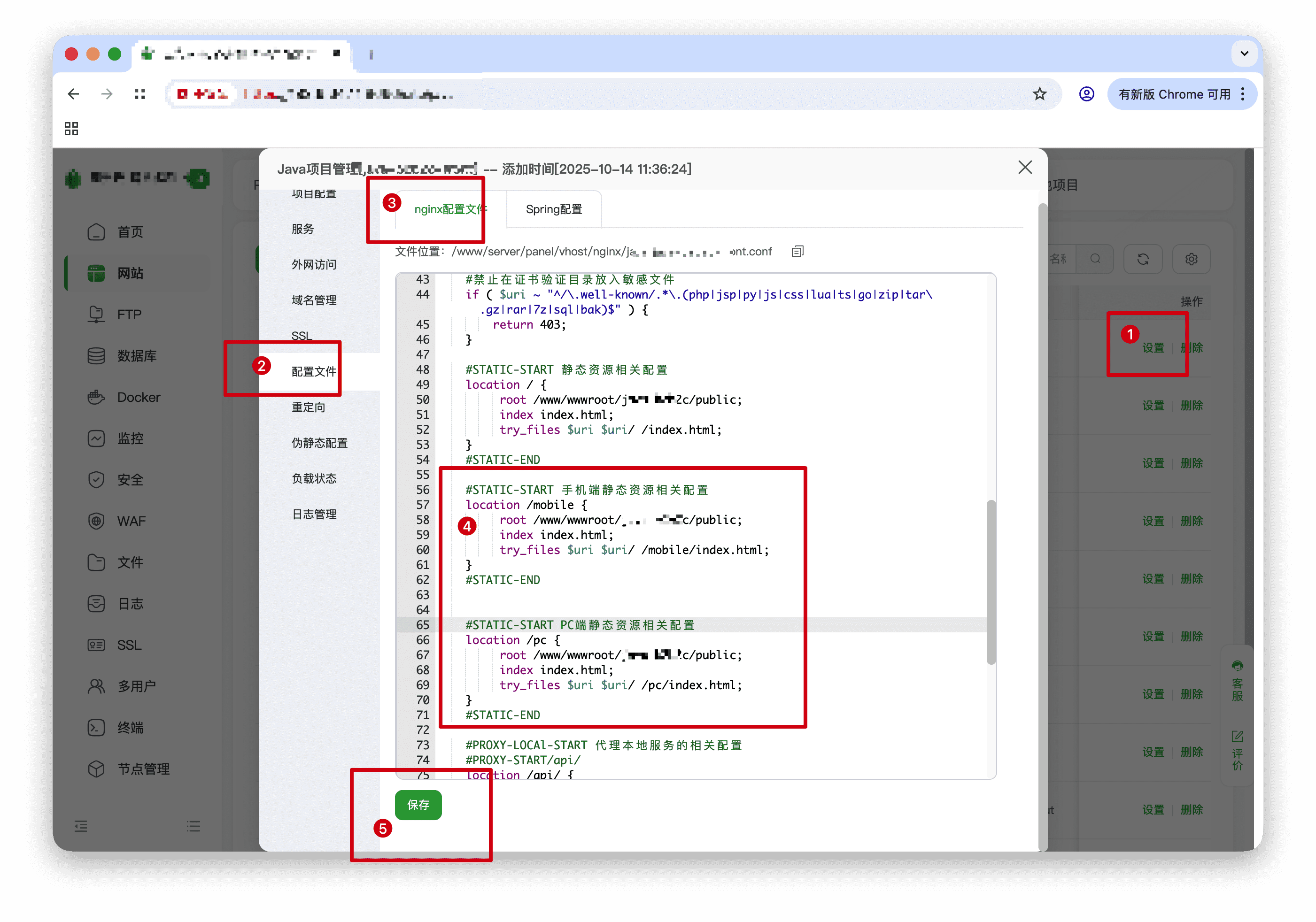 点击【设置】->【配置文件】->【nginx配置文件】,增加以下配置,点击【保存】。