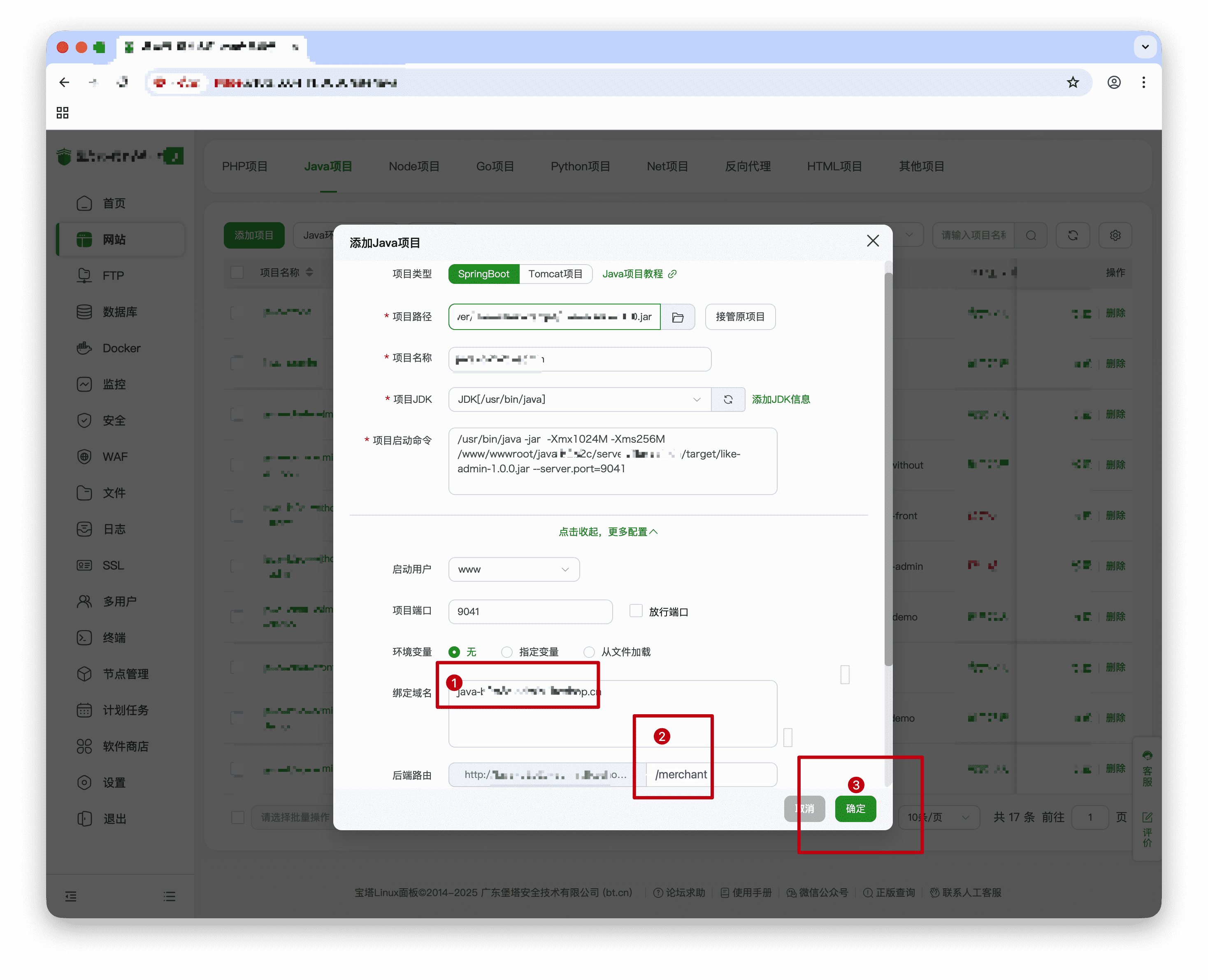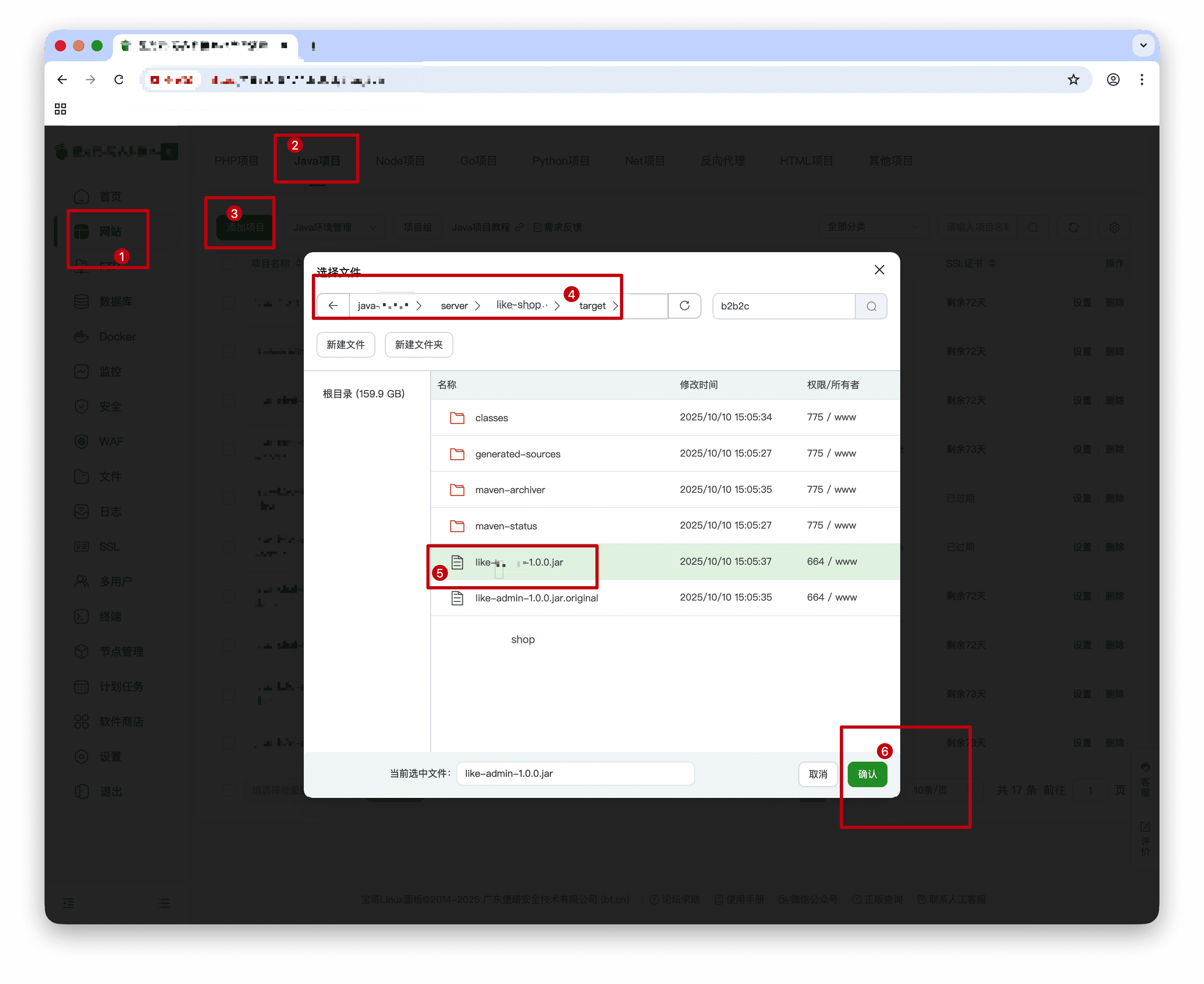 点击【网站】->【Java项目】->【添加J项目】,然后选择项目下编译好的前台jar包server/like-admin/target/like-shop-1.0.0.jar,点击【确定】。